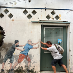 Nous repartons, toujours à pieds, en cherchant encore et toujours le street art, et jouons avec.